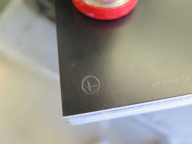 Mida y marque con una cruz en la parte superior de la placa 9mm de la parte superior y lateral. Esto permite suficiente espacio el hardware (un tornillo de Chicago y anillo en D menos la D).