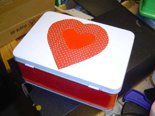 Después de quitar la cinta de pintor, los corazones rojos en las tapas tenían aristas que habría sido difíciles de retocar. En vez, cortar dos corazones de papel (con corazones de centro hueco) que cubrieron las imperfecciones un poco... el da de la frontera de papel un poco más a mano parece de todos modos y me gusta mejor como el corazón pintado era un poco demasiado pequeño para la tapa.