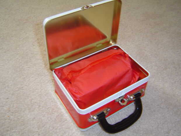 I cortar tres cuadrados de cuero pequeño (negro) y pegado a la parte inferior de la lonchera para evitar que las bisagras de metal en la parte inferior que cualquier superficie se encuentra en.