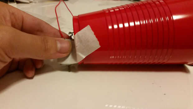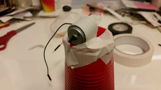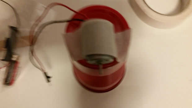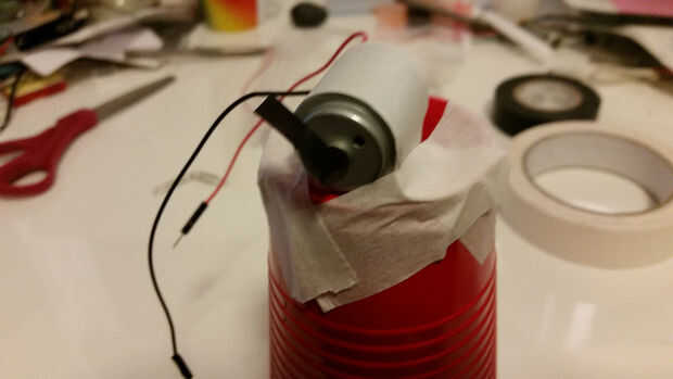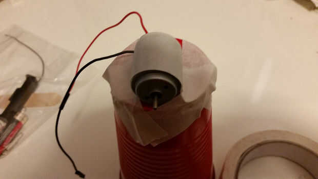 Cinta el motor en el borde de la parte inferior de la taza. El eje del motor debe ser sobresale más allá del borde de la Copa. Reforzar el primer pedazo de cinta con poco más de cinta a cada lado. Envuelva una tira fina de cinta aislante alrededor del eje del motor (para proporcionar el agarre).