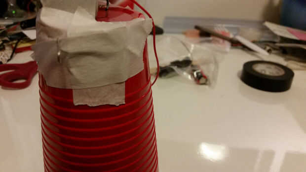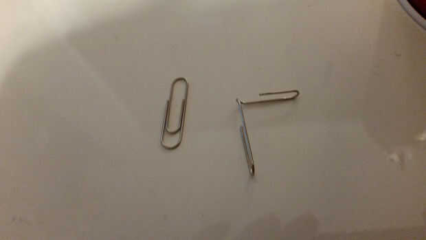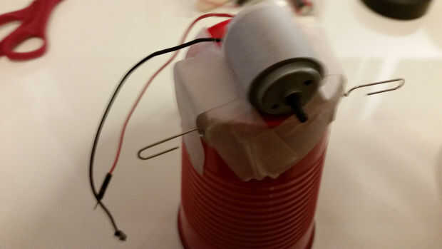 Tomar 2 de los clips y doblarlos como se muestra. La curva interior se debe retirar hasta que quede a 90 grados a la curva exterior. Cinta los clips a los lados de la Copa, para que se peguen hacia fuera como poco las piernas. Estas son para mantener la flipbot de los bancos demasiado.