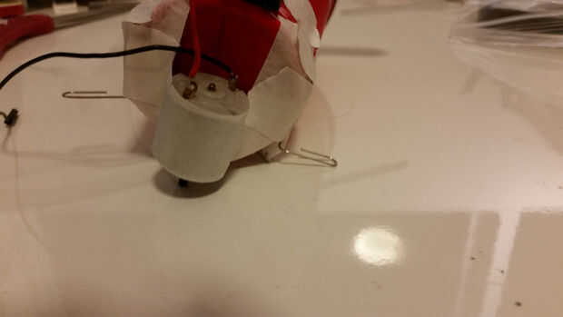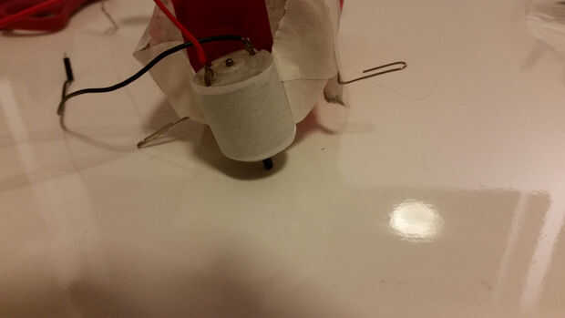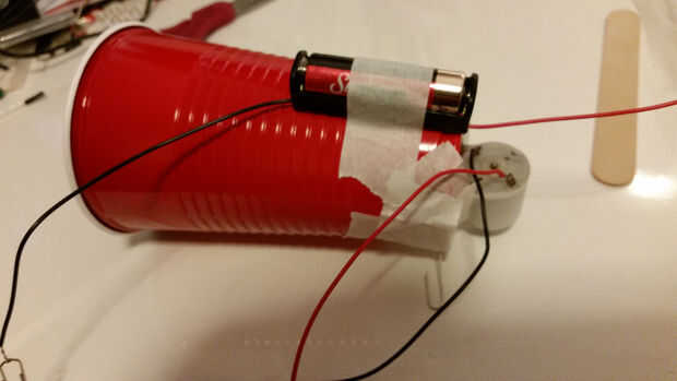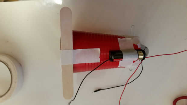 Cinta de la batería en la Copa long-wise y el depresor de lengua para la Copa de la cinta para que quede perpendicular a la Copa, como un ala. Presiona hacia abajo en un lado del ala o la otra debe inclinar el flipbot encima. Usted debe ser capaz de volcar la flipbot a la izquierda y a la derecha sin que volteen hacia atrás a un lado. El eje del motor debe tocar el suelo en todo momento, si se inclina por la izquierda o la derecha.