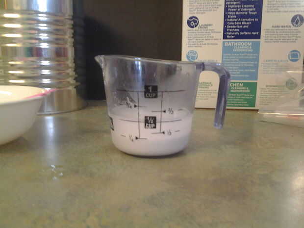 En otro recipiente, poner 2 onzas de pegamento blanco y 1/4 taza de agua tibia.