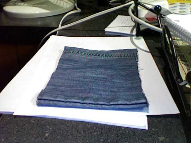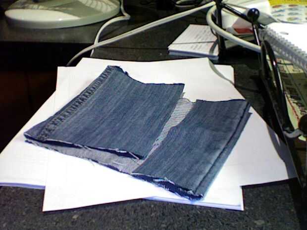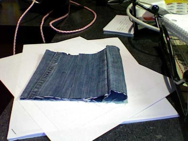 1. corte aproximadamente 8 pulgadas de la pierna de los pantalones vaqueros.