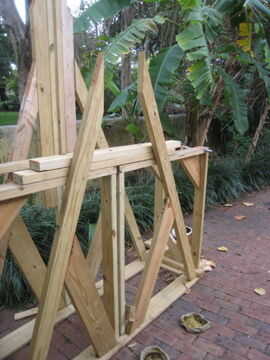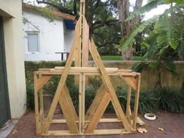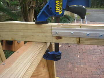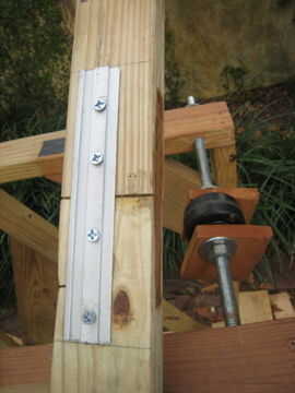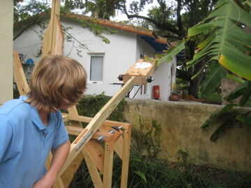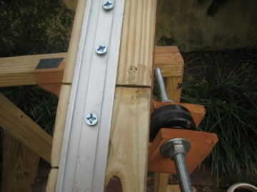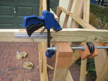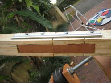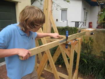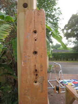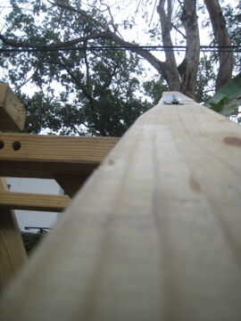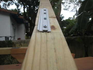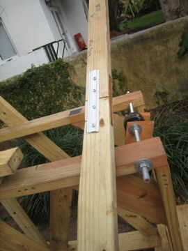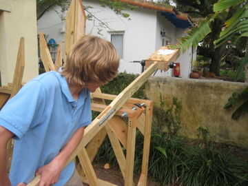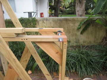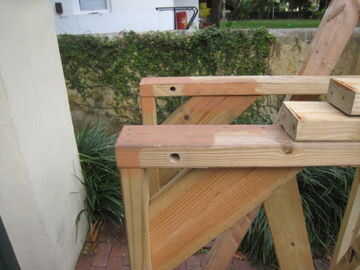 Para pasador las piezas, simplemente haga dos agujeros en el brazo y la extensión. Deben ser perfectamente recto y alineado arriba algún pegamento para madera en los agujeros de goteo y poner pegamento en todo los tacos. Entonces sólo martillo los tacos en los agujeros. Estoy seguro de que hice mi tacos 1/2" de ancho y 8 pulgadas de largo. Por lo tanto, necesitará perforar cuatro pulgadas en el brazo y la extensión. Una vez ambos tacos en una de las piezas, otra línea y golpee hacia abajo sobre los tacos. Asegúrese de que hay pegamento todo ellos. Para hacer esto, estaba el brazo verticalmente en el suelo, luego subió a la cima de una escalera con un mazo. Alineado los orificios con las clavijas y el martillado de la casa. La costura debe ser tan estrecha como sea posible.