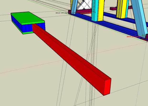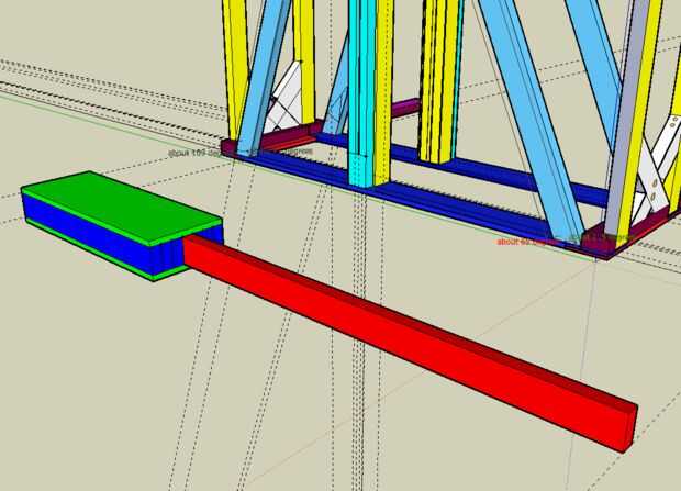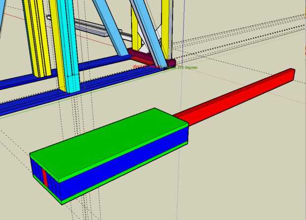 Así que para una relación 3.5:1 y viga de 7 pies, mi brazo corto sería 1,55 pies y mi brazo largo sería 5,6 pies, más o menos. El agujero del tornillo eje perforado en el brazo corto 1,5 pies desde el extremo.