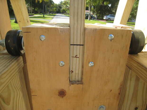 6. por último, cortar el rectángulo de madera para que no golpee la rueda sobre el borde de la madera contrachapada como el brazo cae. corte de 6 pulgadas desde el borde, a lo largo del brazo de 7 pies de largo.