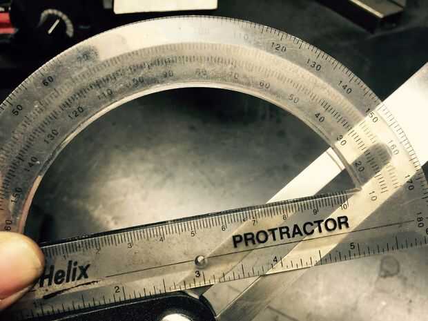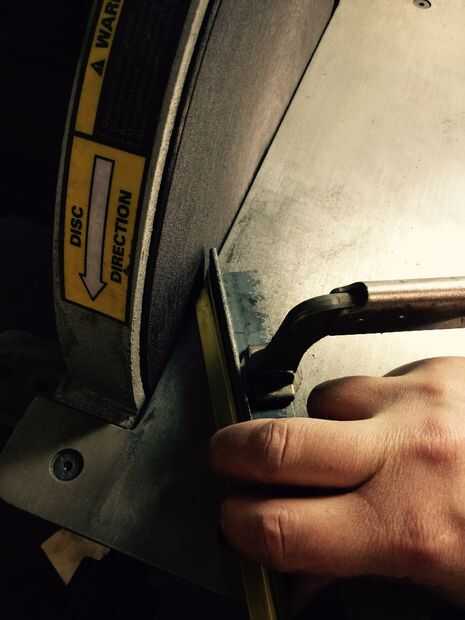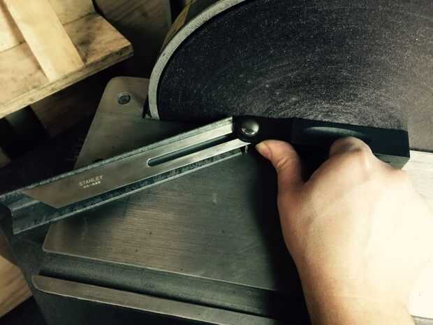 2. Configure la pieza de hierro de ángulo contra la amoladora de banco 30 grados frente a la arena.