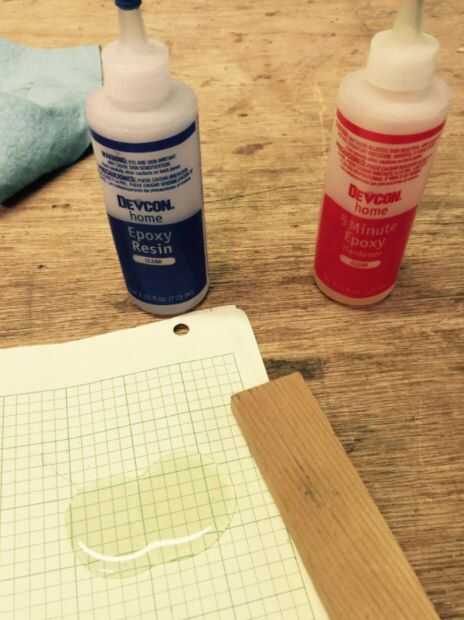 2. después de retirar la tapa reemplazable, exprima cantidades iguales de resina y epoxi en una superficie desechable y mezclar bien.