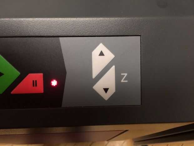 9. presionando Indicador eje z (que es arriba y abajo flechas) en el panel de interfaz de plataforma láser, el nivel adecuado de cama hasta que entre la lente y hoja de acrílico clara.
