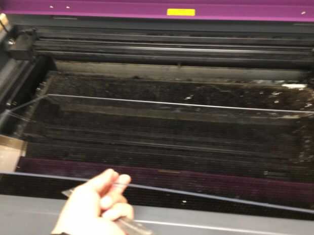 * Hay quemaduras en los bordes de acrílico porque puse la velocidad de corte demasiado lenta y la energía era demasiado fuerte. Puede evitar esto colocando pedazos de acrílico de chatarra (mismo espesor) debajo el acrílico principal de 18 x 36 pulgadas y el enfoque la lente a la altura elevada. Por suerte las marcas de quemadura son lo suficientemente delgadas para que puede ser cubierto por las tiras de latón en la parte superior.