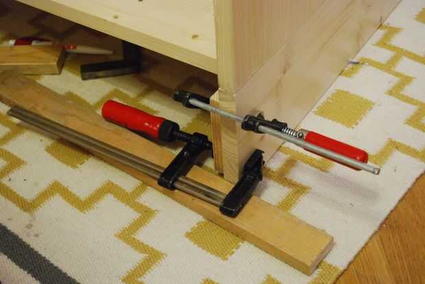 Este paso es fácil. Pega las clavijas en su lugar y añadir suficiente pegamento en las juntas. Pegue el estante para libros encima de la cama y deje que se seque. Como elemento final de la construcción, la librería debe ser cerrado (por lo menos quiero estar cerrada) en la parte posterior. Tenía una hoja de contrachapado cortado a la medida en la tienda de hardware y colocar algunos trozos de madera en el interior de los rieles laterales para dar a la madera un lugar para atornillar. Si tienes un router, podría hacer agradables ranuras en ambos lados y deslice la madera contrachapada en. Pero yo no, así que esto tendría que hacer. Con tornillos para madera cabeza redondeos unos adjunta la hoja de madera contrachapada para los desechos de la madera.