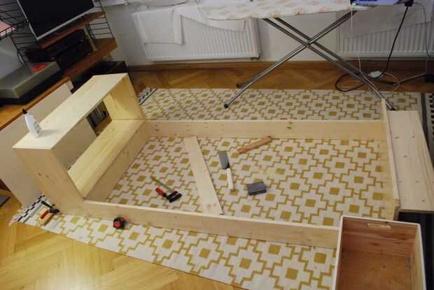 En mi caso tuve que hacer una pequeña modificación para que la cama de ajuste entre la pared y el radiador. El pequeño estante en el cabecero debe ser un poco más corto. Mide dos veces y corte una vez. Como todo lo demás perforó los agujeros en los lados de la primera plataforma y luego en la cabecera. Sólo para estar seguro he añadido dos pequeños soportes debajo del estante en el cabecero. En caso de niño de mi (o cualquier otro) tendría la idea de subir o sentarse en él.