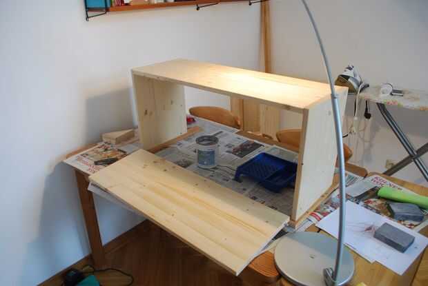 Primero tomó la parte inferior de la estantería y había pegado los dos taquetes en el lugar que le fungate como el punto de giro más adelante. Luego la parte superior de la librería consiguió pegada entre las dos partes y también agregué el fondo pivotante. Entonces rotaba el fondo un poco para evitar la construcción de derrumbarse, porque luego apilados un vinilo encima de ella para conseguir cierta presión agradable en todas las conexiones y el pegamento.