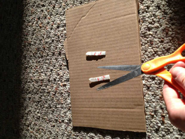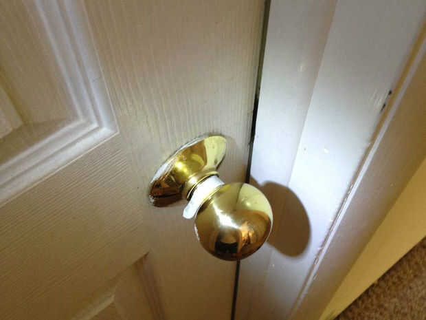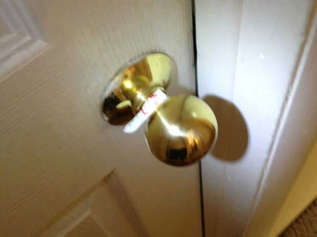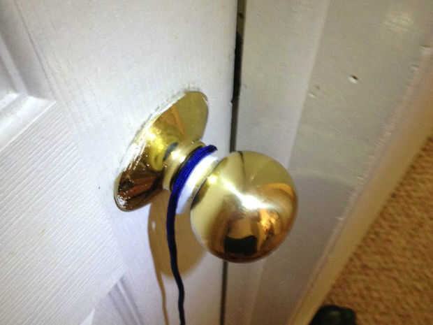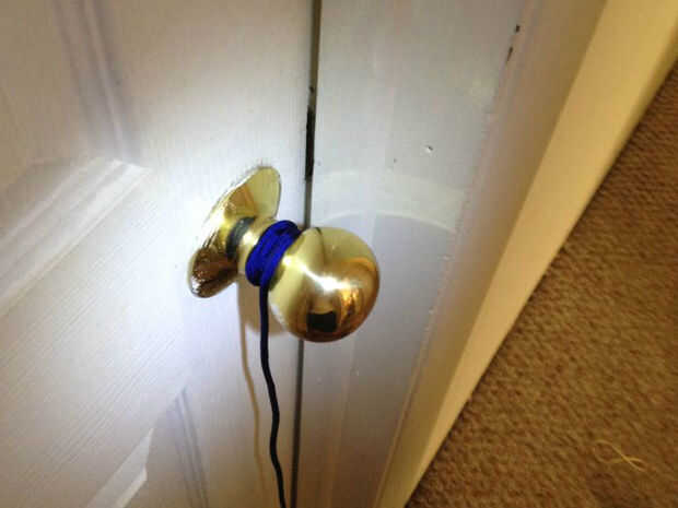 Utilice tijeras para cortar una tira de comando del cartel de 3M por la mitad longitudinalmente. Coloque el adhesivo "lado de la pared" en la parte superior del eje del pomo. Exponer el adhesivo "lado del cartel" y poner una sección de cable en la parte superior. Enrolle el cable ajustadamente alrededor del eje por lo menos cinco veces que el cable cuelga apagado de la cara no el marco de la puerta. Deja 6 pulgadas entre el accesorio de pie y el suelo.