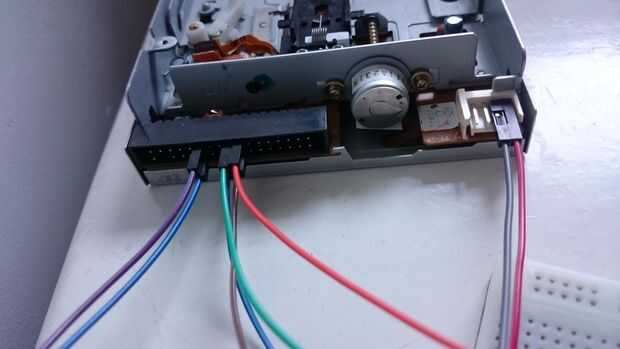 Conectar el pin 18 de la unidad de disquete al pin 11 en el Pi (gipo 0) es el cable amarillo y rojo en la fotografía.