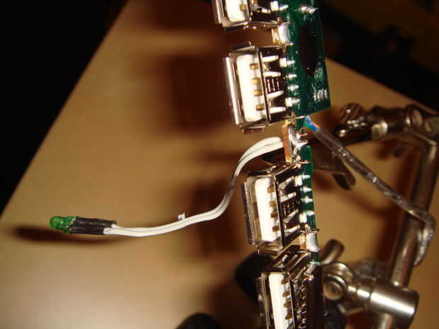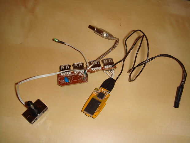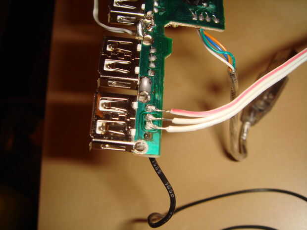 En la parte inferior de la Junta Directiva necesita soldar los cables a los cuatro contactos y una en la pantalla donde se encuentra el puerto de 'falso'. Efectivamente está conectando le oculta en coche hasta el punto antes de los 5 voltios se ha cortado. Cuatro de esos cables se va directamente a la unidad USB y uno para el interruptor de láminas se oculta unidades (línea de 5v).