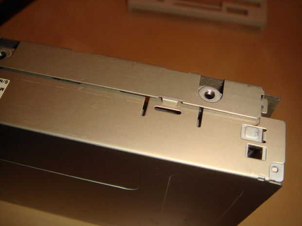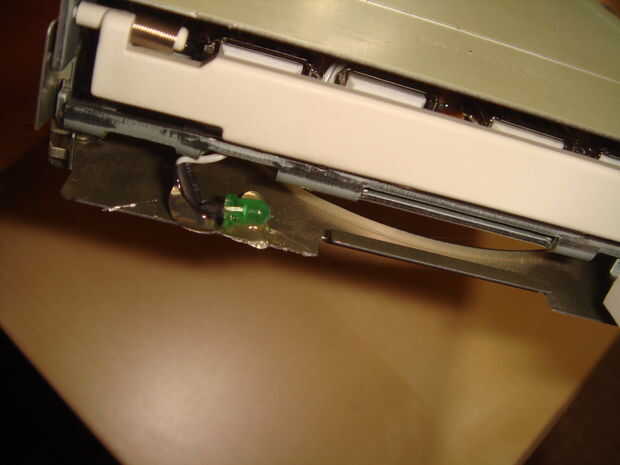 Echa un vistazo de donde viene el LED en el panel delantero. Necesitaba cortar una pequeña muesca para que el LED a sentarse. Esto varía de modelo a modelo de la unidad de disco flexible. Algunos tendrán fijación al panel al caso.