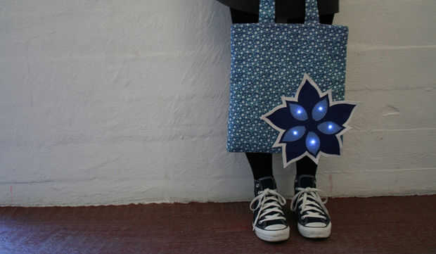 Patrón de bolso y gráficos impresión en 100% algodón; Programado LilyPad Arduino; 5 LEDs sewable; Hilo conductor; Baterías recargables y cargador incluido.