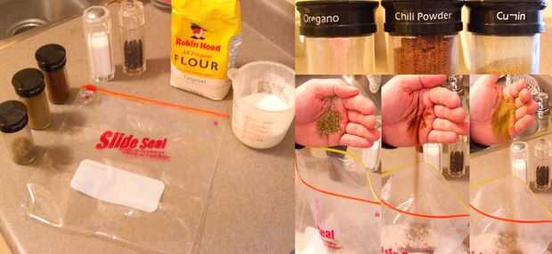 Para esto necesitarás una bolsa de plástico grande, de harina y especias al gusto. He utilizado orégano, Chile en polvo, comino, sal y pimienta. Las variaciones son infinitas, comparte tus ideas en los comentarios.