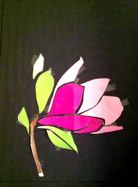 Podría dibujar la flor justo en la tela pero decidí cortar cada pétalo y hoja y cinta adhesiva en el reverso de mi tela. (Si lo haces de esta manera, asegúrese de que tener un duplicado de dibujo práctico.) Voy a la máquina de coser en el lado equivocado, ya que la puntada se ve casi igual en la parte delantera y trasera de la tela, más no quería marcar el lado bueno de mi tela.