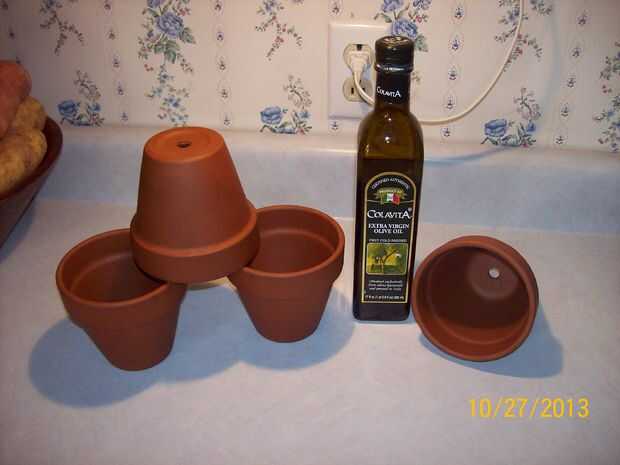 Ahora, antes de comenzar a hornear en las macetas necesita limpiar y los de la temporada. Para limpiarlos, los fregué abajo con un paño húmedo. Para la temporada les tienes dos opciones. El Sr. Keller recomienda profunda freír las ollas de 8 a 10 minutos y dejan enfriar. Esto es bastante rápido, pero no todos tenemos freidoras y toman mucho aceite. La otra opción es limpiar las macetas abundantemente con aceite (yo prefiero de oliva) para cocinar, hornear en un 275 * Fahrenheit horno durante unos treinta minutos, dejarlos enfriar y repetir tres veces.