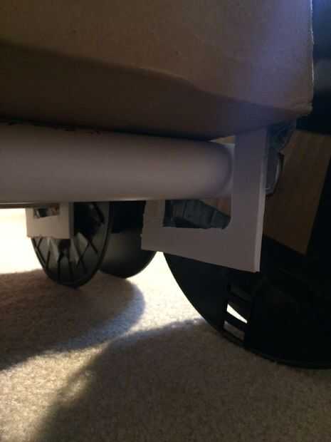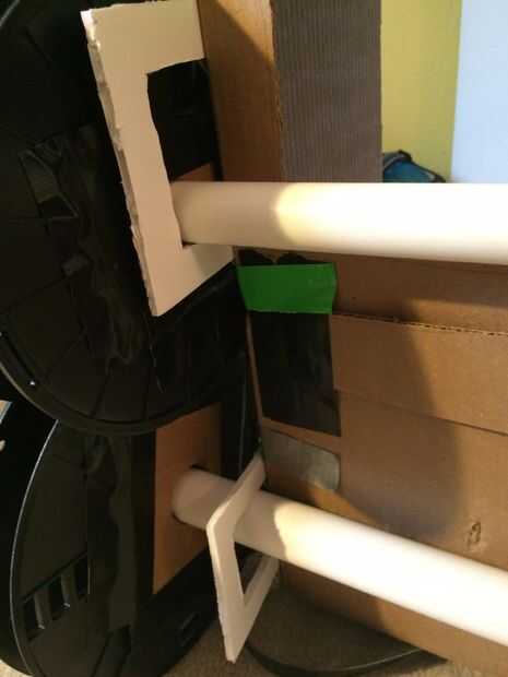 Para que las ruedas a girar correctamente, usted necesita ayudas al vagón. Esto se puede hacer por cuatro cuadrados de cartón extra. Las fotos que adjunto deberían ayudar a hacerlos. Una vez haya terminado, poner en la caja con cinta adhesiva. Deben ser uniformemente separados y la espalda debe estar alineada con el agujero.