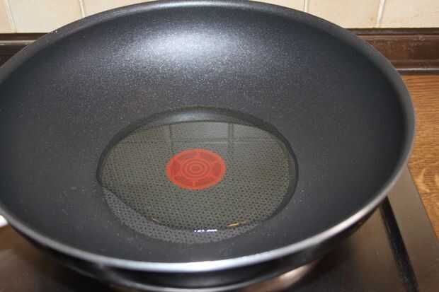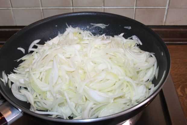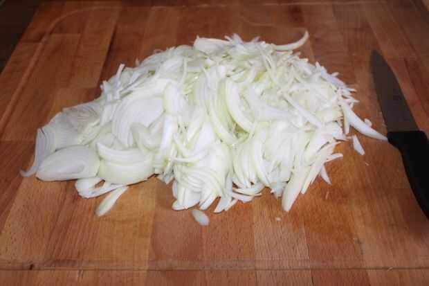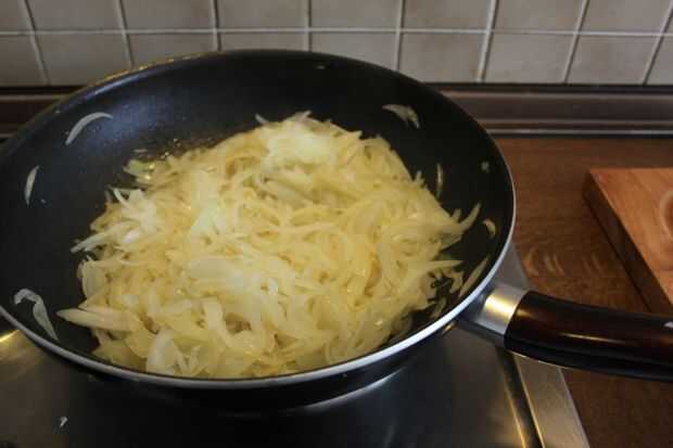 Pelar y lavar las cebollas. ¡ Cortarlas finamente. Calentar el aceite en una sartén grande y rehogar removiendo a fuego lento. Utilicé un poco más de aceite de la receta.