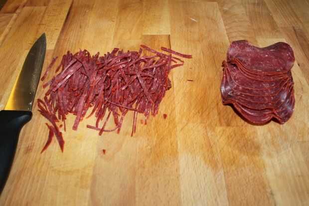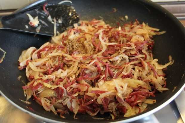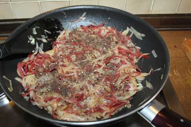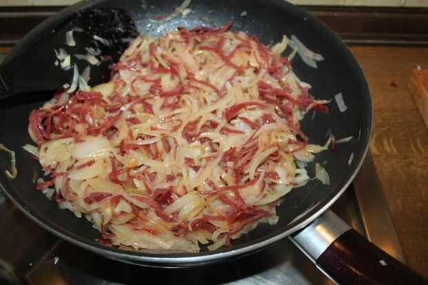 Cortar el bacon muy fino y añadir a la cebolla. Usé tocino carne de vacuno. Mantener revolviendo brevemente. Sazonar con sal, pimienta y tierra comino. Sacar del fuego y dejar enfriar.