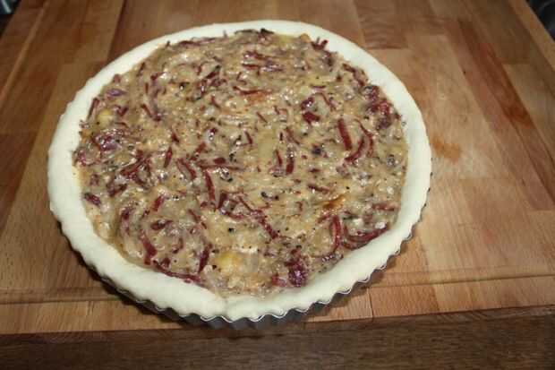 Tarta de cebolla caramelizada con salvia corteza de patata dulce Tarta de cebolla caramelizada: esta es una tarta deliciosamente refinada que lleva mucho menos trabajo y tiempo que usted podría pensar. Las sobras "sprinkles" también están para c
