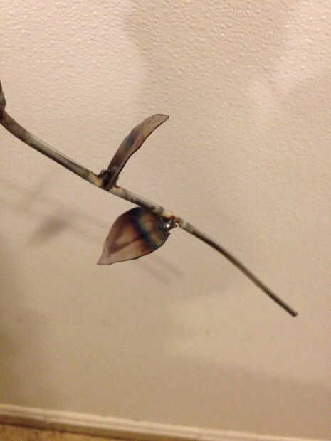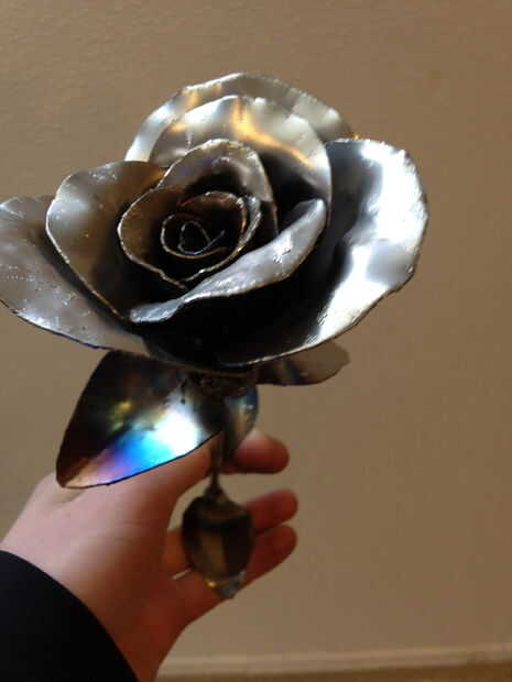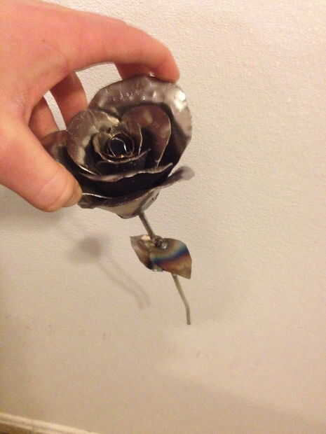 se trata de una simple rosa metal o algún tipo de flor que hice con algunos repuesto del metal de hoja. Tomó un tiempo para hacer, pero que fue principalmente debido al hecho que solo tuve unas pequeñas tijeras y tuve que cortar cada pétalo y hoja con la mano... También se necesita algo de práctica para cada pétalo de la curva en forma y tienes que esperar a que se enfríe cada vez después de soldar con autógena (consiguió algunas quemaduras por acometer). Lo que me pareció más fácil era hacer parcialmente simétrica como se puede saber, y a soldar primero los pétalos primeros en curva a forma y luego hacen el siguiente conjunto de pétalos. En las fotos no está completa ya necesito para moler y pulir las soldaduras con una dremel.