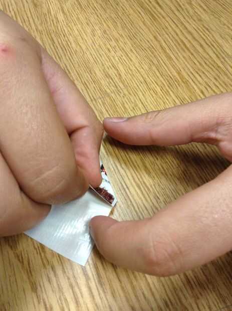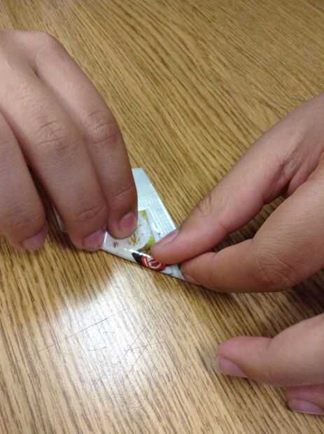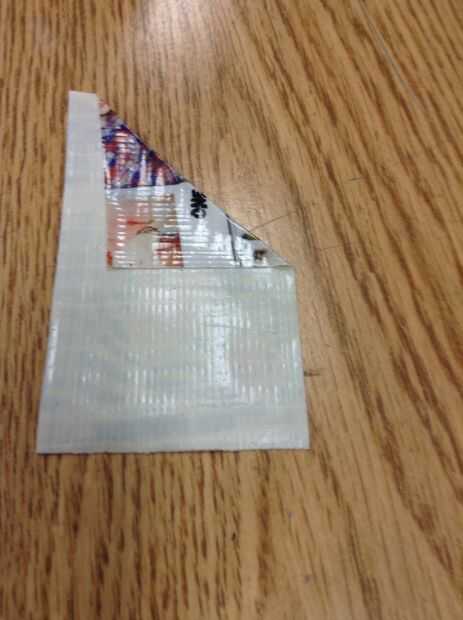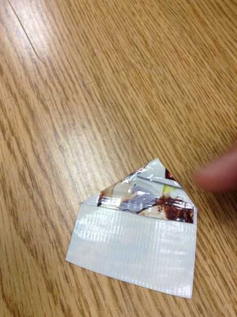 Para empezar a hacer pétalos necesita recoger una de estas piezas de la cinta sólo se cortan. Luego se dobla un lado pegajoso hacia el otro lado pegajoso. Después de hacer aún tienes un poco de un lado pegajoso por lo que tendrá hacer al otro lado. Cuando termines tus pétalos deben parecerse a una casa. Hacer esto a todas tus prendas.