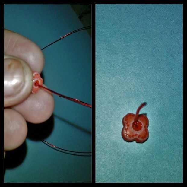 Luego tome un palillo de alambre de joyería en el centro flor del grano y corte un cable restante con tijera. Deje un montante pendiente por horas.