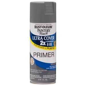 Rocíe una capa ligera de imprimación de gris marca Rustoleum sobre todas las superficies de cada parte, excepto dentro de las dos macetas a la mitad. Dejar secar durante 3 horas.