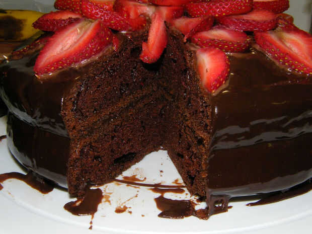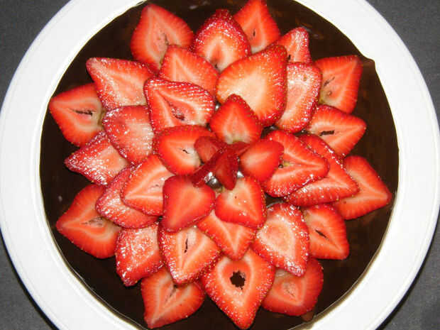 Se puede decorar con rodajas de fresa inmediatamente o esperar un poco hasta que el esmalte es reafirmante en torta (para que fresa no deslice hacia abajo)