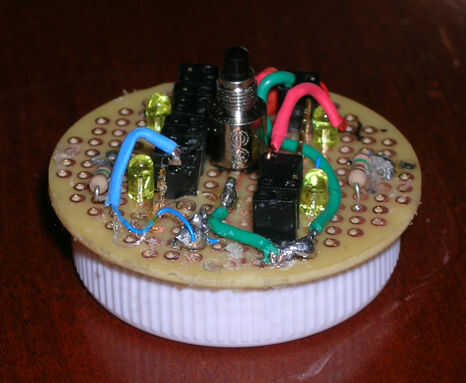 Dos tapas de botellas se utilizan en este proyecto, uno tiene los LEDs y tiene un agujero para el botón en el centro, el otro tiene un imán de tierra rara y es una tapa protectora para el microcontrolador. El PCB es más grande que las tapas pero la ilusión es verse en la noche, aunque yo quiero que se vea profesional en el control de la luz, no es necesario que sea una completa encapsulación de la Junta.