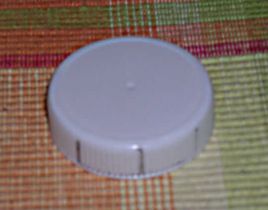 Perfore un agujero del mismo diámetro que la parte roscada del botón, el botón sobresaldrá a través en el centro de la tapa y la rosca debe proporcionar un ajuste de interferencia. Con un cuchillo del Exacto, corte el sello pequeña cresta en la parte interior superior de la tapa; asegurándose de no cortar hacia los dedos ni carne, que mantiene la sangre se escape.