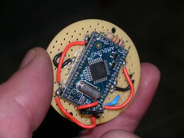 Elegí el Arduino Mini para este proyecto debido a su tamaño y también cuánto diversión que tuve con otras placas Arduino. El Arduino Mini es un completo circuito con un microcontrolador ATmega168, un reloj de 16 MHz, un regulador de potencia, memoria y una serie de pines de entrada y salidas; algunos digitales y algunos analógicos.