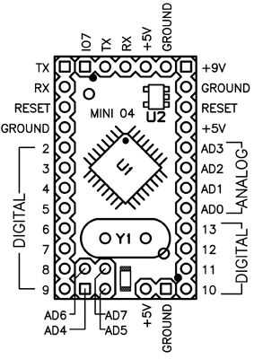 Utilice el diagrama de los pines que se pueden encontrar en la página de Arduino; Asegúrese de tener en cuenta el número de versión del micro-controlador que está utilizando, las clavijas son diferentes entre las versiones 03 y 04. http://Arduino.CC/en/Main/ArduinoBoardMini