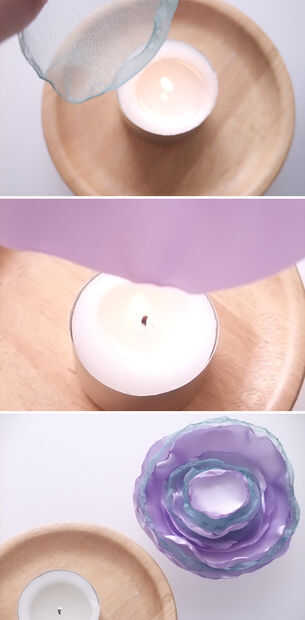 Encienda una vela y mantenga círculos de raso y gasa en las manos para reducir el tamaño por el calor de la vela.