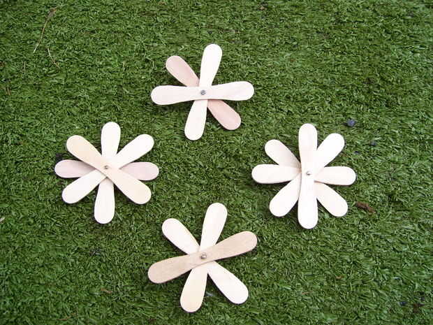 Perforaciones a través de los centros de la polo se pega usando una broca apropiada para la fijación elegida de método. Puede utilizar tantos palos de Polo como quieras. Usé tres y cuatro patas para hacer estos. Los palos de polo en el tornillo del hilo de rosca. Usted será capaz de decidir en este momento cuántos palos de polo quiere tener.
