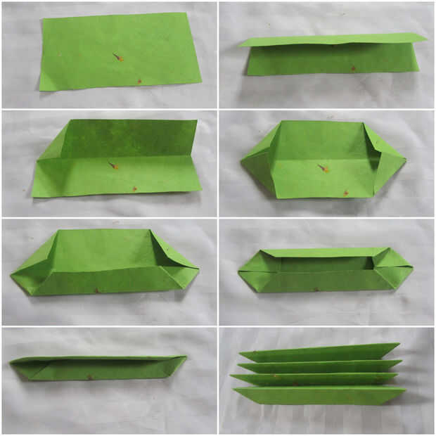 Los pasos del plegado de las hojas son los mismos que hicimos para los pétalos. Siga la imagen de arriba para obtener instrucciones sobre cómo doblar el papel para las hojas. Por último, debe tener cuatro pétalos de la flor de loto.