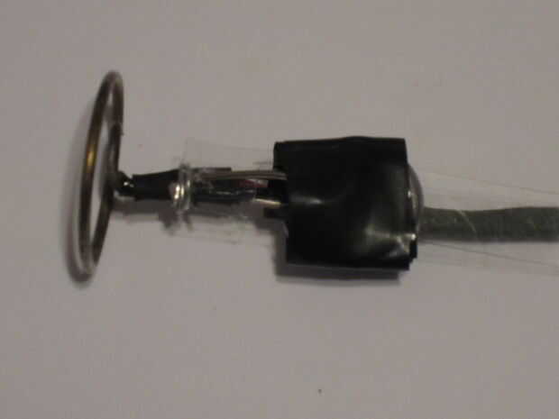 No tengo un interruptor de repuesto colocación, por lo que acabo de poner uno juntos. Las pilas se llevan a cabo en lugar de cinta aislante y un pedazo de plástico delgado separa una de las conexiones (el clip de la carpeta) de la batería. Hay una ranura de corte en el plástico, por lo que cuando se despliega permite el metal y la batería para tocar y completar el circuito.