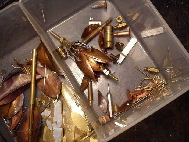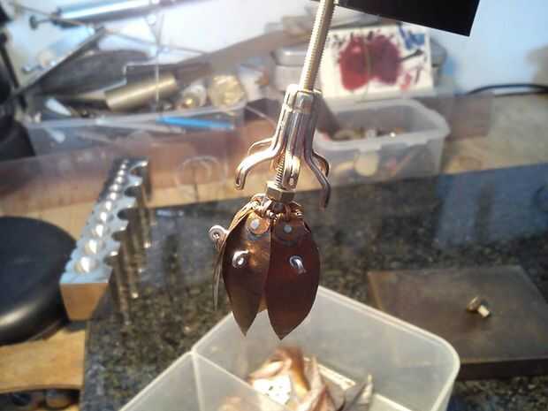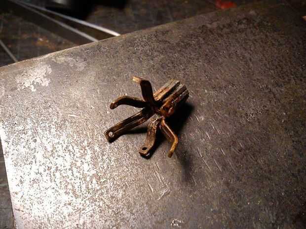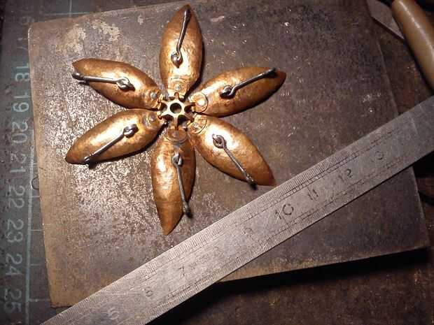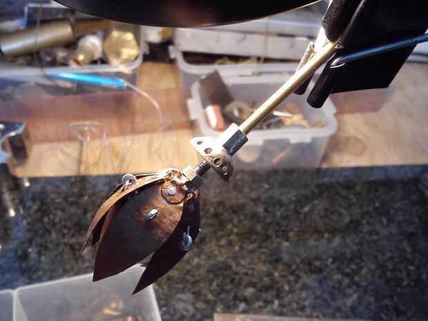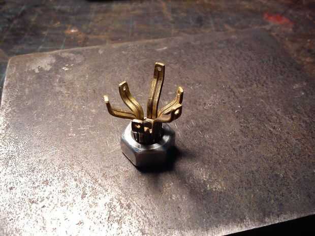 Estas parte se sueldan a una tuerca de latón (con rosca interior), que puede moverse arriba y abajo girando. Que permite la flor abrir o cerrar.