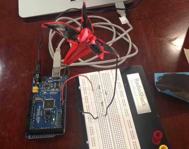 El resultado que se muestra aquí utiliza pintura Pelada conductora para dar una proximidad de flor de origami poderes de detección. Cuando pones tu mano cerca por, activa un pequeño motor vibrante, y la flor se ondula alrededor para decir "¡ Hola!".