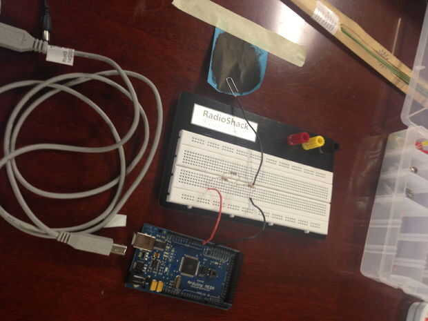 El circuito es bastante simple: conecté un cable del pin 4 en el arduino a la placa. A continuación, conectar 3 resistencias de 10MOhm en serie (para dar resistencia 30MOhm) y había conectado al final de esta cadena al pin 2 de arduino. Finalmente, el extremo de la cadena de resistencia fue conectado a un clip con un hilo de cobre. Entonces conecté el clip de papel directamente al papel pintado con pintura conductora, que actúa como un condensador con aire como dieléctrico y mi mano como segundo conductor. Esto sigue el tutorial de desnudo casi exactamente.