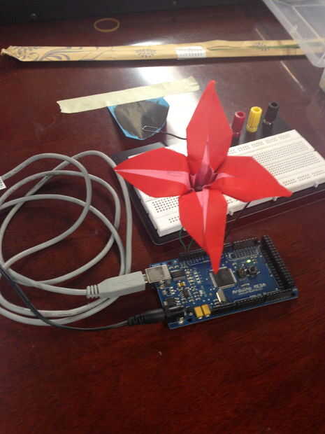 Al principio, empecé con un sensor de proximidad de prueba de un post-it, pintado con pintura de desnudo. Una vez pude comprobar que mi dibujo estaba trabajando, estaba entonces lista para incluyen la flor de origami.