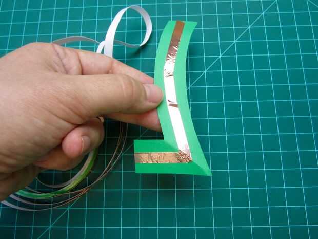 En la parte delantera del L Coloque una tira de cinta de cobre conductora de arriba hacia abajo en el centro del tronco hacia la parte inferior de la L como se muestra. No extienda la cinta en el L.