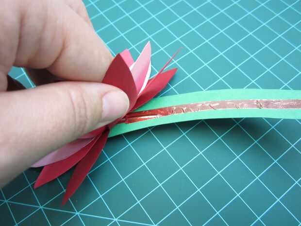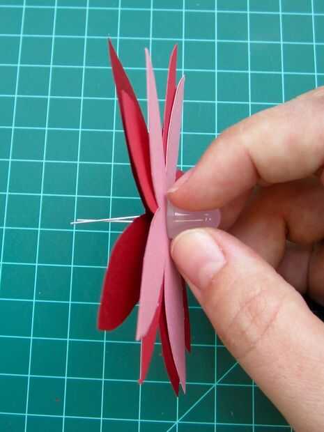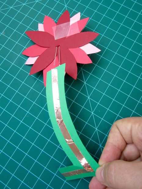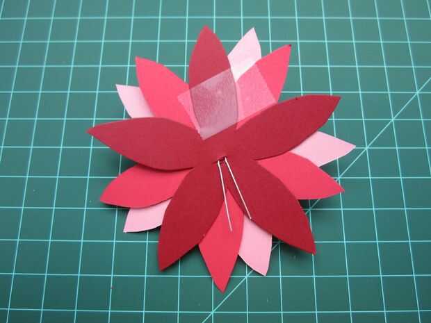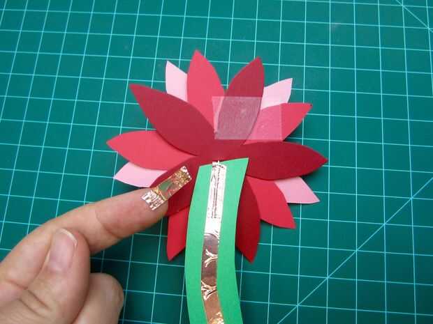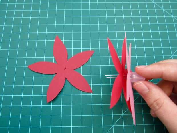 Corte una abertura en el centro de los pétalos de la flor. Ambas piernas del LED a través de las rendijas del hilo de rosca y dobla las piernas 90 grados. Puede utilizar una tira de cinta adhesiva o pegamento stick para garantizar los pétalos compensar entre sí como se muestra.