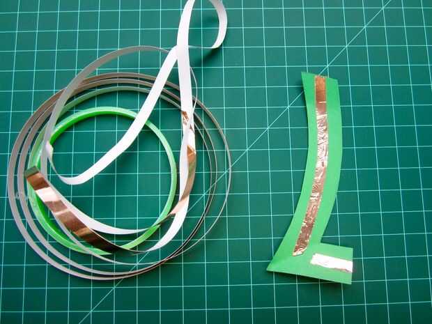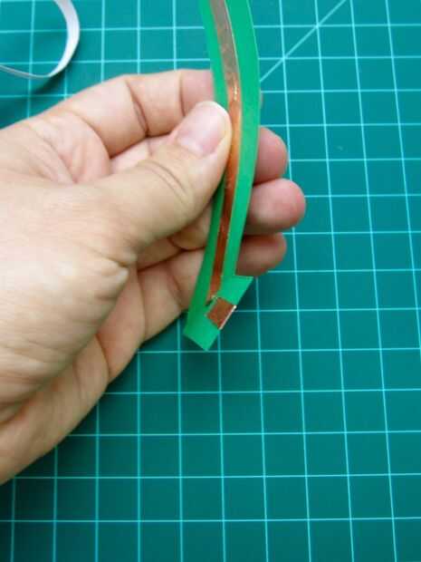 Ejecutar una tira de cinta de cobre conductor desde la parte superior de la L por el centro, a la vuelta de la esquina y hacia arriba y sobre la parte inferior de la L en la parte delantera. La flor funciona mejor si se trata de una sola pieza continua. Si la cinta se rompe, eliminarlo y empezar de nuevo. No extienda la cinta hasta que toque la primera tira en la frente, como esto se corta el circuito.